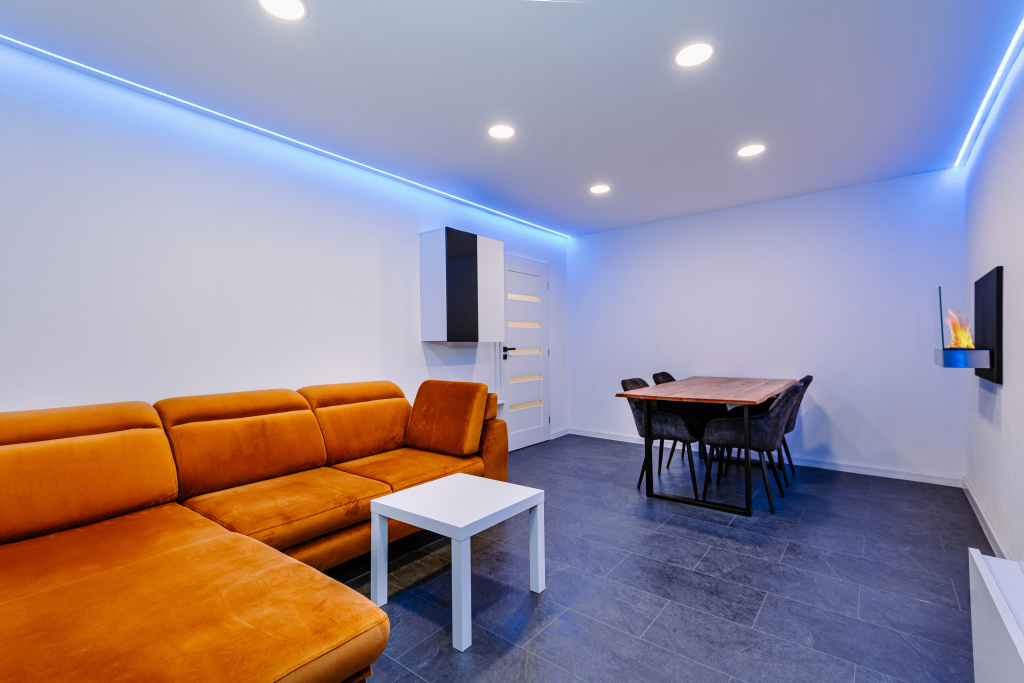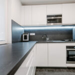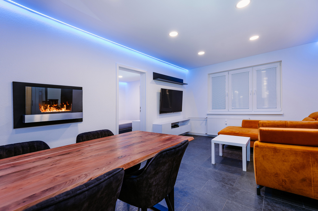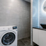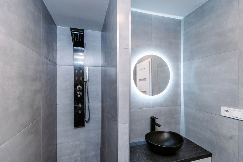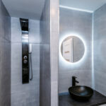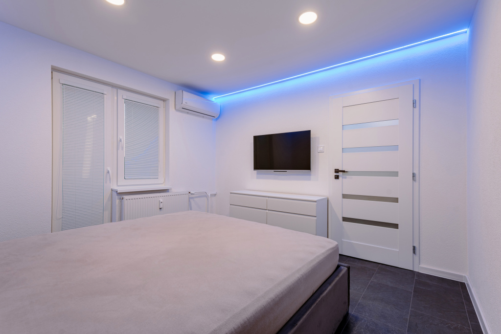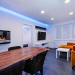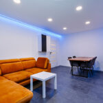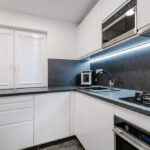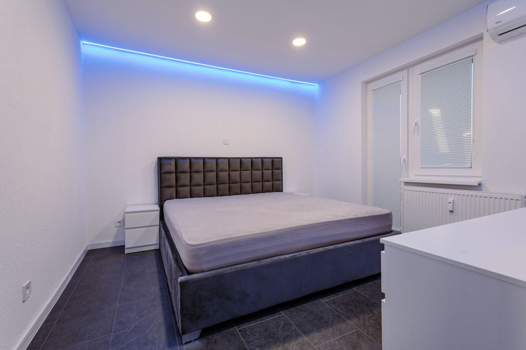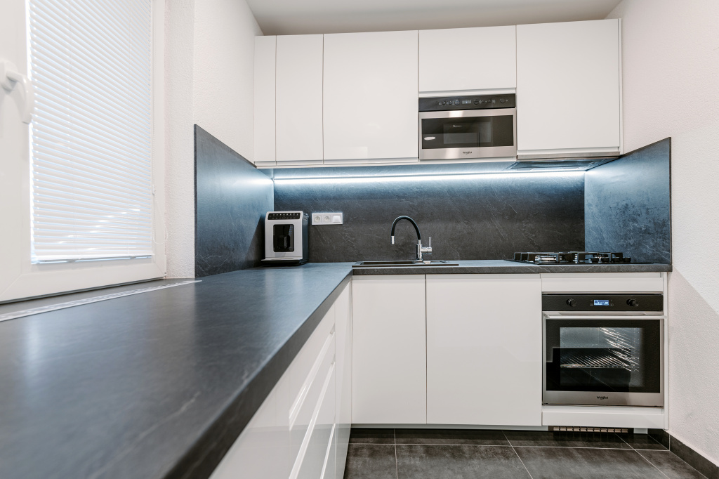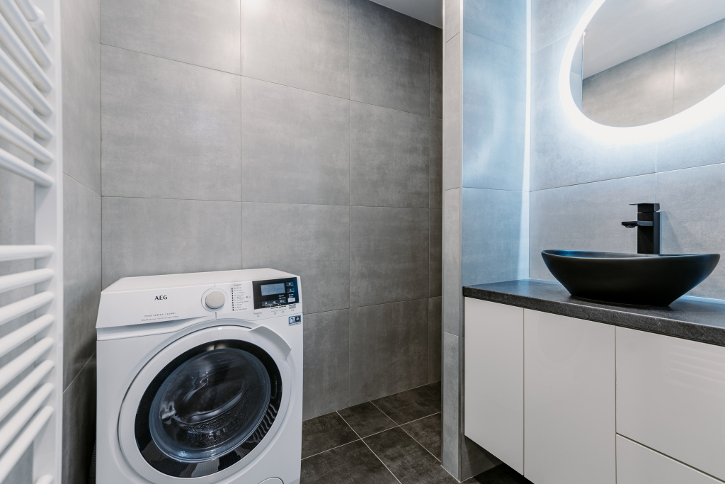 Kúpeľňa a WC sú vizuálnym zážitkom – dizajnová čierna sanita v kombinácii s kvalitným obkladom a dlažbou posúva tento byt do kategórie moderných penthouse apartmánov. Žiadne visiace káble. TV, optický internet aj zásuvky sú integrované priamo v stenách bez viditeľných káblov a predlžovačiek. Svetelnú atmosféru dotvárajú LED pásy s diaľkovým ovládaním a inteligentné vypínače, ktoré menia náladu bytu jedným kliknutím.