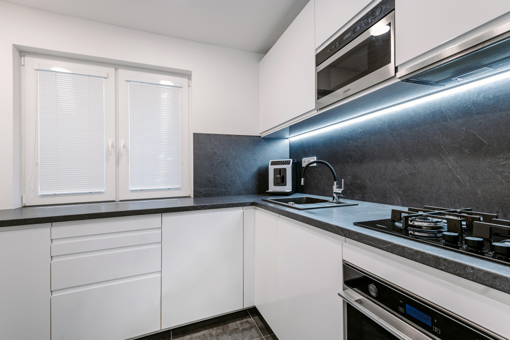 Linka IKEA Metod Voxtorp v minimalistickom dizajne. Nájdete tu zabudovanú plynovú varnú dosku Whirlpool, úplne novú (nepoužitú) elektrickú rúru a inteligentne vyriešený digestor s priamym vývodom do ventilácie. Príprava na umývačku riadu je tiež samozrejmosťou.